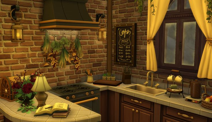 Your typical kitchen area! The pinewood floors around the rest of the lounge continue into both in the kitchen and dining. The first thing one might notice when walking is that there's the smell of fresh bread out of the oven lingering in both sections, and it never really goes away, comforting and warm. Otherwise, the general feel of this place is almost industrial: brown cabinets with gold knobs, with the countertops being tile, a brick backdrop, lighting in the form of lanterns hung from the wall, and a brassy metal sink. Above that sink is a window that looks out over the grassy hills, framed by yellow curtains. There's not much in the way of other decoration on the walls, save for the poster of a lemon in sexy lingerie haphazardly slapped on the wall.
